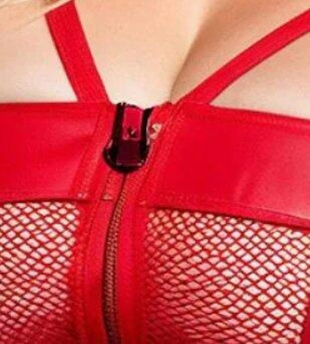 • Front-opening zip bra with open mesh cups for provocative appeal.