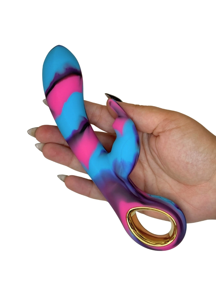 Bold, vibrant, and unapologetically playful—this beauty is rocking a swirl of neon pink, electric blue, and deep purple like it just strutted off a cosmic runway. With that golden loop handle giving off serious luxury vibes, it’s not just a toy, it’s a statement piece.