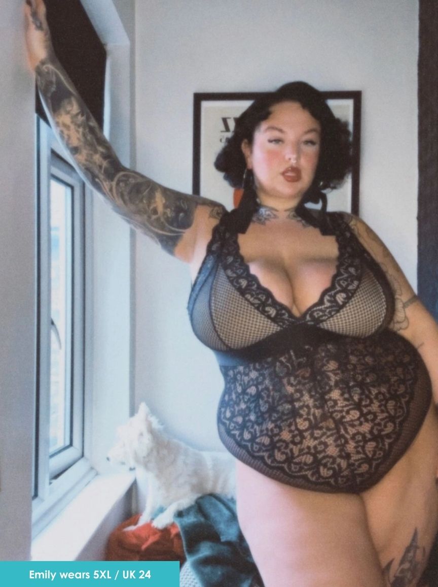 Woman wearing a black lace bodysuit against a plain background