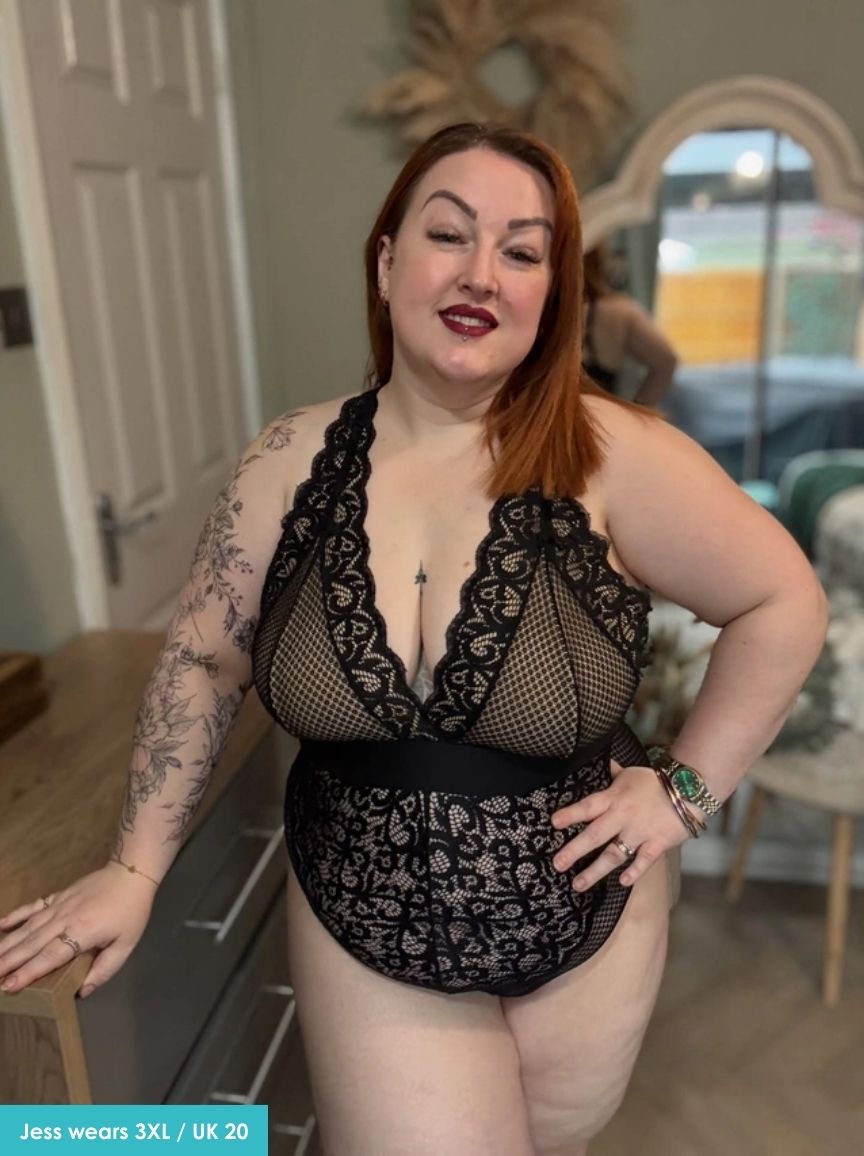 Serving curves, sass, and a whole lot of confidence—this beauty is all about that deep plunge and lace-on-lace drama. The scalloped trim frames your neckline like a total showstopper, while the deep waistband cinches you in just right. And that intricate lace paneling? Chef’s kiss perfection that flatters every inch.