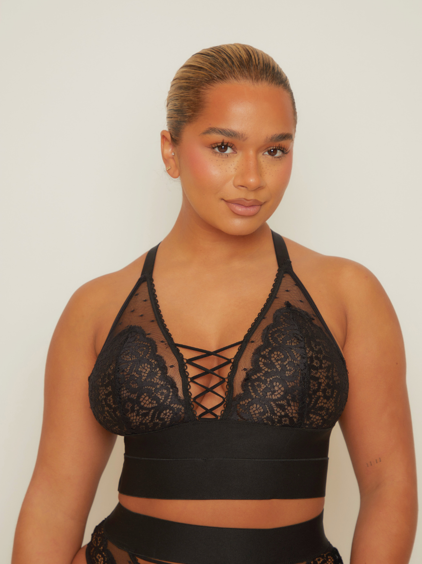 A Tutti Rouge best seller the Maya bralette wows with sheer spot mesh and our signature lace featuring a caging front and back! Perfect for everyday wear or paired with jeans and a blazer for a super sexy and glam night out look!